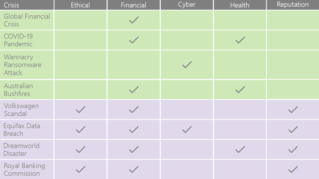 Note that each crisis affects organisations in different ways, and that from different perspectives, different boxes could be ticked than are presented above. The table is to be read as an illustration of how a crisis may be categorised, rather than a comprehensive analysis of specific events.
