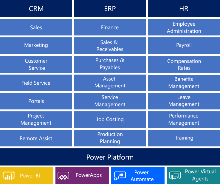 Microsoft Dynamics 365 is a suite of integrated business applications including CRM (customer relationship management) and ERP (enterprise resource planning) that can be extended and customised using the Power Platform.