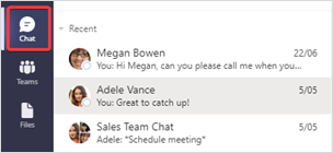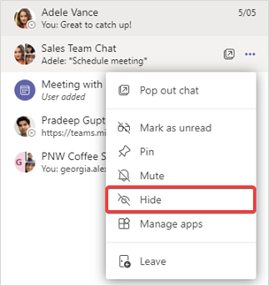 You can also choose to hide a message if it is no longer relevant to clean up your chat feed. To hide a chat, select Chat and then next to the chat you want to hide select More options > Hide.