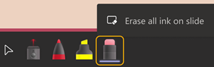 To erase a single mark, select the eraser and then select an ink mark. To erase all the marks, select Erase all ink on slide. To stop drawing, select the curser or press the Esc on the keyboard.