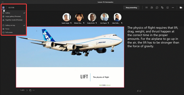 You can choose Together mode to interact naturally with your colleagues and without visual distractions. Select Gallery on top to display all video feeds at the top of your meeting window. This view makes it easier to have more natural eye contact with other meeting participants. You can select Focus to hide all video feeds and focus your attention fully on the shared content. Lastly, you can use Full Screen to remove all other desktop distractions.